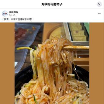 【台湾竟然没有凉皮吃?网友:除非有大陆姐妹做才有得吃】近日,海峡导报小编在脸书上发布了一条美食推文,“小调查:台湾有这种拌凉皮吗”,引发热议。这是小编在河南旅游时,于网红商超“胖东来”购买的凉皮。凉皮里面不仅有黄瓜丝、花生米、佐料还有厚厚的一层豆芽铺底,一大碗只要8元人民币,还贴心的赠送口香糖。来自台中市的网友Gong Qi分享道:“有大陆姐妹会做来卖。”